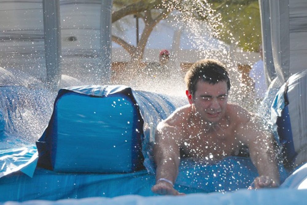 SAFE BREAK: Mechanical engineering freshman Dillon Armstrong shoots across a water slide at an ASU Safe Spring Break Send-Off event on Wednesday afternoon. (Photo by Rosie Gochnour)
