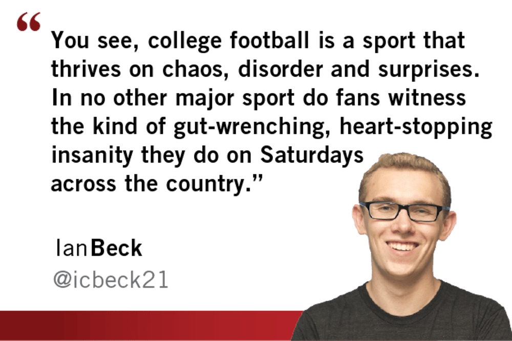 You see, college football is a sport that thrives on chaos, disorder and surprises. In no other major sport do fans witness the kind of gut-wrenching, heart-stopping insanity they do on Saturdays across the country.