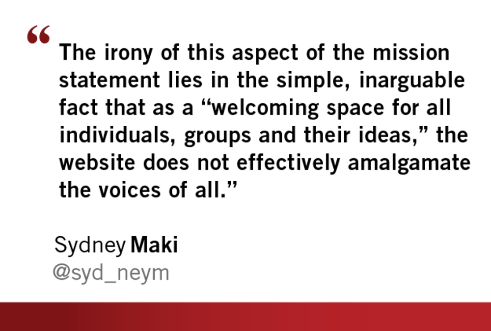 The irony of this aspect of the mission statement lies in the simple, inarguable fact that as a “welcoming space for all individuals, groups and their ideas,” the website does not effectively amalgamate the voices of all. Separating different perspectives creates an unnecessary division and victimization of certain groups and all of the other media included on the site. Although there is merit to a clearly defined location for groups to share their stories and interests, broad generalizations take place beneath the too specific headlines. Assumptions, social stigmas and inordinately standardized beliefs are allowed to run rampant.