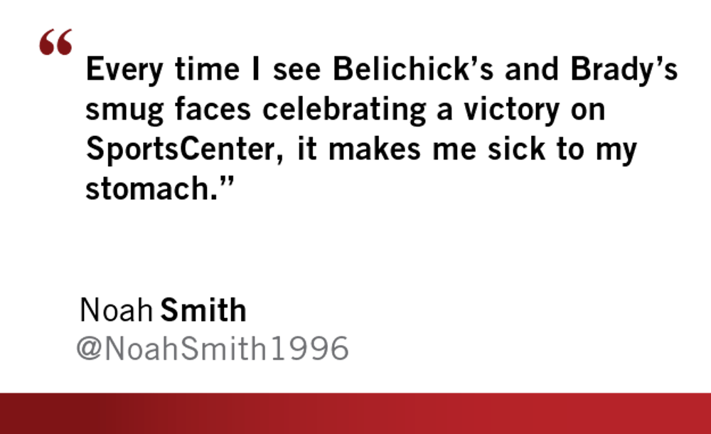 Without him upholding that standard across the league, we would probably be dealing with issues of coaches taping opposing teams' signals or something like that (I’m suspecting you, Tony Dungy!). I think that the issue here is our greatness — every team is jealous of our success, and they are looking for any way possible to get a competitive advantage over us! We, all the loyal Patriot “fans” born and raised everywhere other than Boston, are deeply disturbed by this news.