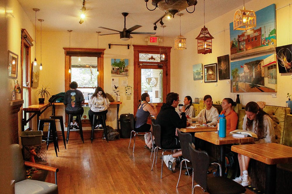 The coffee shop hosts Open Mic, book clubs, and one-off activities nestled away in their back room. With a makeshift stage, local art on the walls and string lights decorating the ceilings, the spot is suited for students to engage with each other.