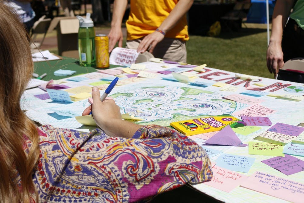 ASU students write notes to mother earth for the ASU Earth Festival 2017 on Hayden Lawn in Tempe, Arizona on Wednesday, April 19, 2017.