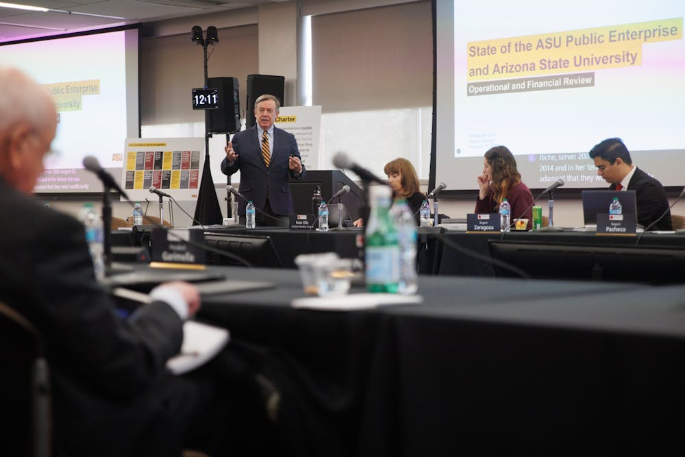 ASU President Michael Crow presents an “operational and financial review” of the University to members of the Arizona Board of Regents in the Memorial Union building on Thursday, Feb. 13, 2025 in Tempe.