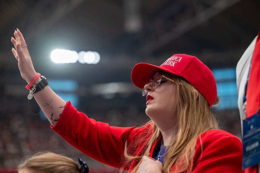 People worshipping before Charlie Kirk’s memorial service at State Farm Stadium on Sunday, Sept. 21, 2025, in Glendale.