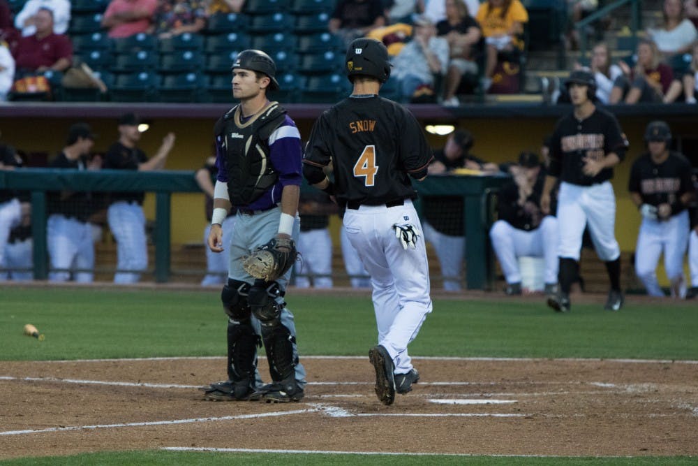 Freshman Andrew Snow scores off a single by sophomore Colby Woodmansee in the bottom of the second inning against Tennessee Tech Friday April 24, 2015 at Phoenix Municipal Stadium. The Sun Devils defeated the Golden Eagles 6-3.