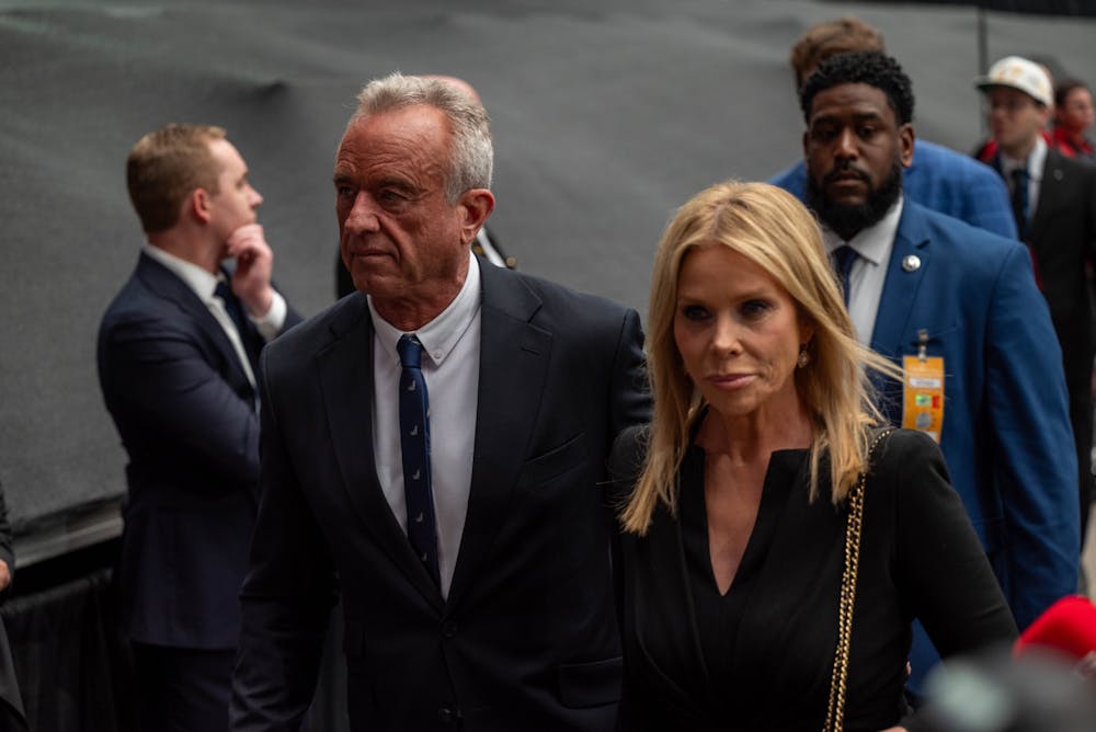 U.S. Secretary of Health and Human Services Robert F. Kennedy Jr. (left) and his wife, Cheryl Hines, in attendance of Charlie Kirk’s memorial service at State Farm Stadium on Sunday, Sept. 21, 2025, in Glendale.