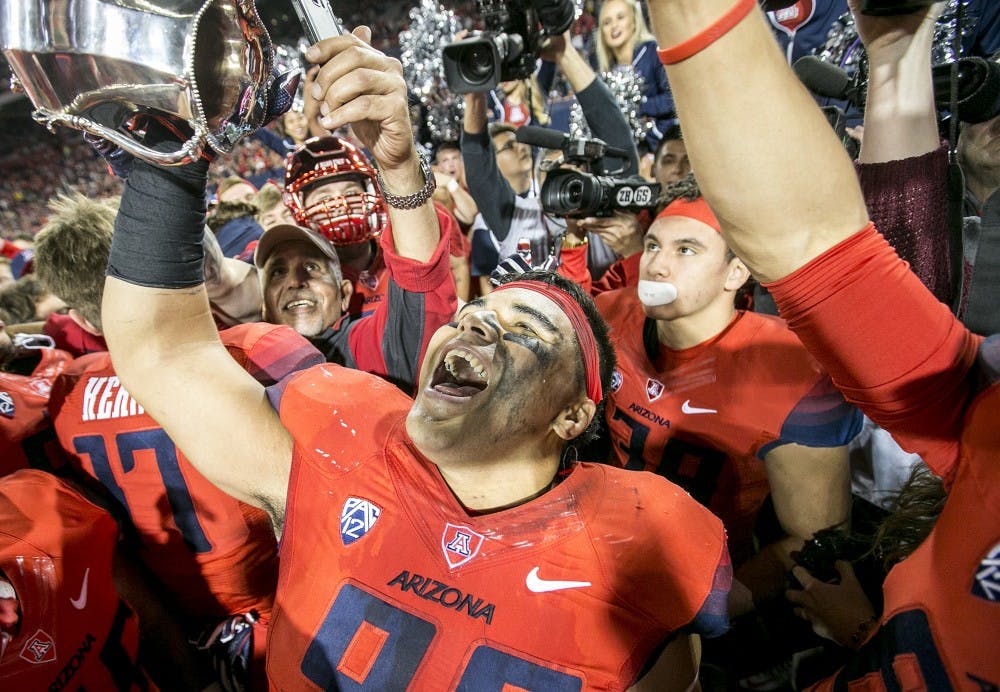 UA defensive lineman Sani Fuimaono lifts the Territorial Cup after defeating ASU in a football game in Tucson's Arizona Stadium on Friday, Nov. 25, 2016.