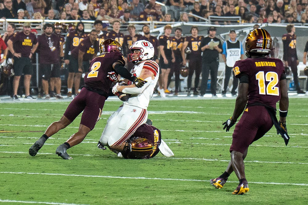 ASU redshirt junior defensive back Xavion Alford (2) makes the tackle against Utah at Mountain America Stadium on Friday, Oct. 11, 2024, in Tempe. ASU won 27-19.