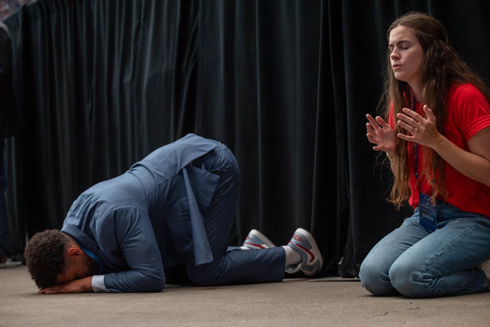 People worshipping before Charlie Kirk’s memorial service at State Farm Stadium on Sunday, Sept. 21, 2025, in Glendale.