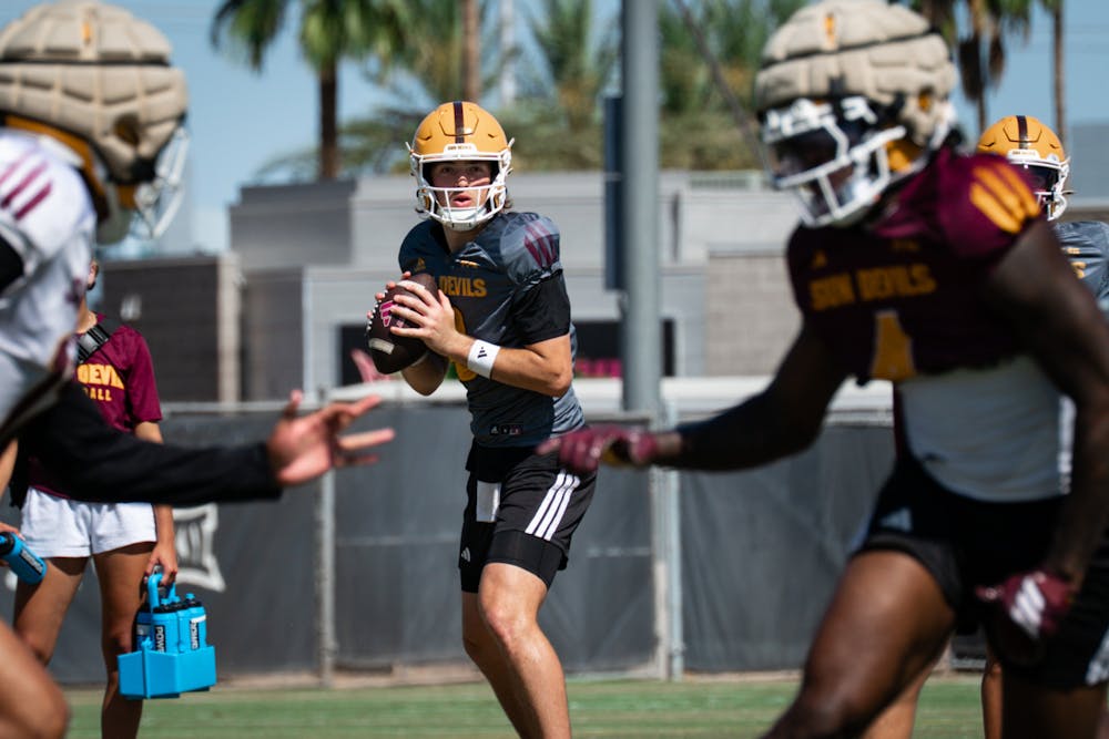 By Madison Haynie | April 16, 2026ASU freshman quarterback Jake Fette (2) throws a pass to redshirt junior wide receiver Jaren Hamilton (16) run drills at spring practice on Tuesday, April 7, 2026 at Kajikawa practice fields in Tempe.