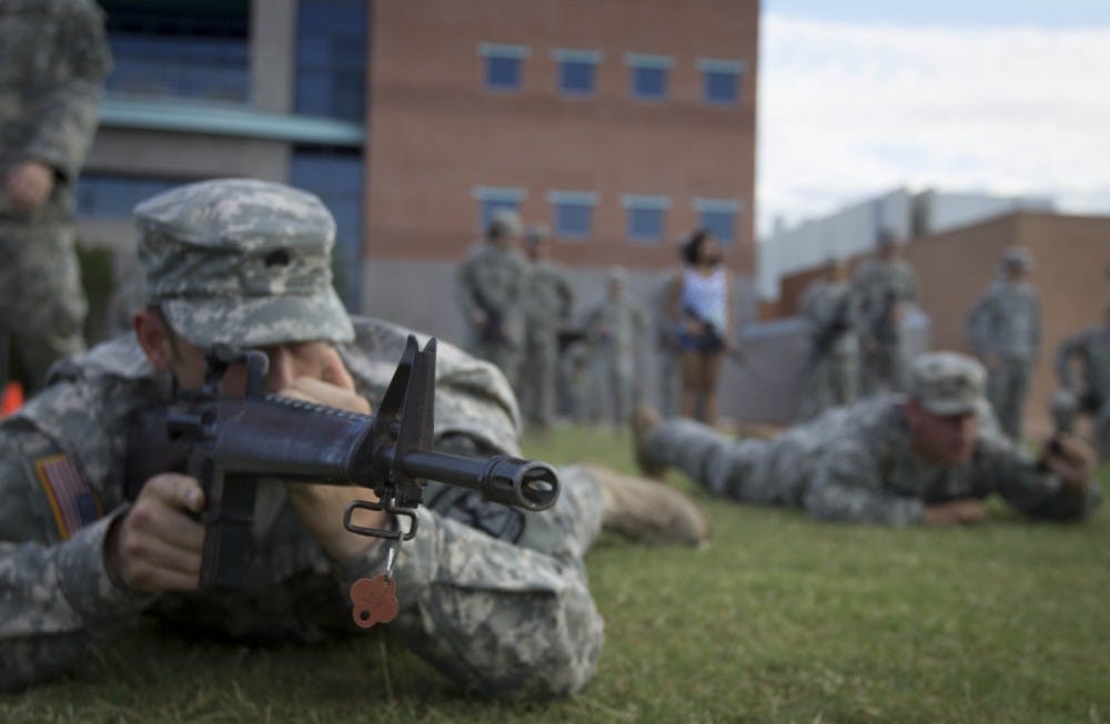 A "rubber ducky" rests in a cadet's hands, pointed towards the 12 oclock position. The Army ROTC training program began Wednesday Aug. 28 at the SRC fields at ASU's Tempe Campus. (Photo by Dominic Valente)
