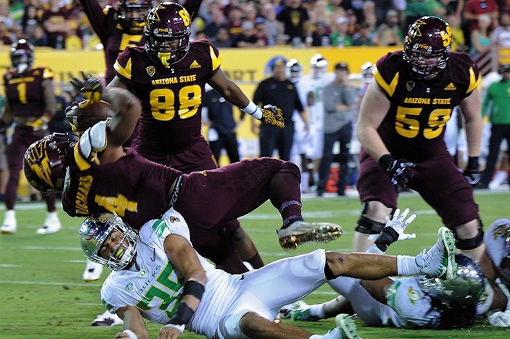 Senior runningback Demario Richard (4) rumbles into the endzone over Oregon's Troy Dye (35) in the second half of the Sun Devils' 37-35 victory over the Ducks on Saturday, Sept. 23, 2017 at Sun Devil Stadium in Tempe, Arizona.