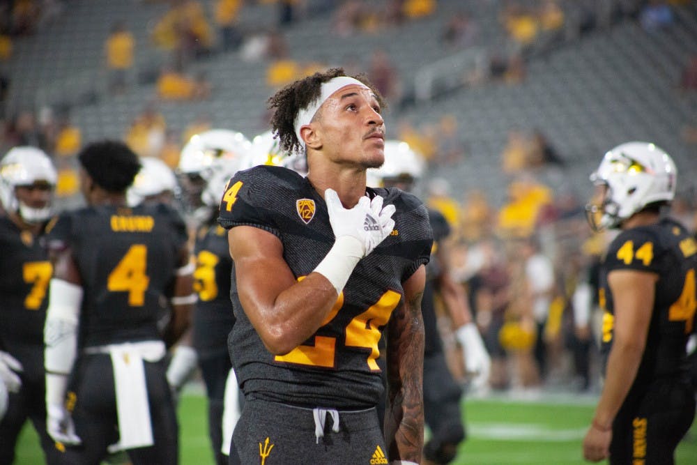ASU redshirt sophomore running back Chase Lucas (24) holds his hand over his heart before the game against Oregon State University in the Sun Devil Stadium in Tempe, Arizona, on Saturday, Sept. 29, 2018.