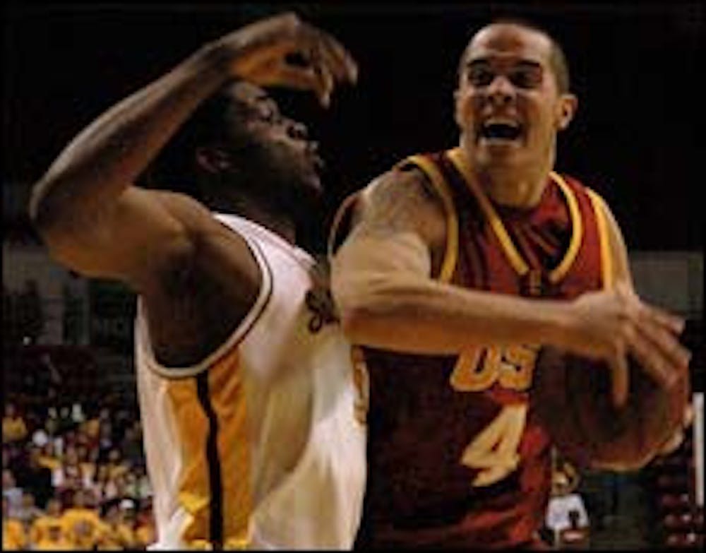 ASU junior forward Ike Diogu guards USC senior forward Gregg Guenther in the first half of a 98-94 loss on Saturday to the Trojans at Wells Fargo Arena.