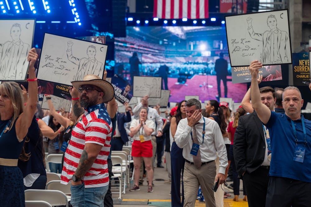 Crowds of people hold up signs at Charlie Kirk’s memorial service at State Farm Stadium on Sunday, Sept. 21, 2025, in Glendale.