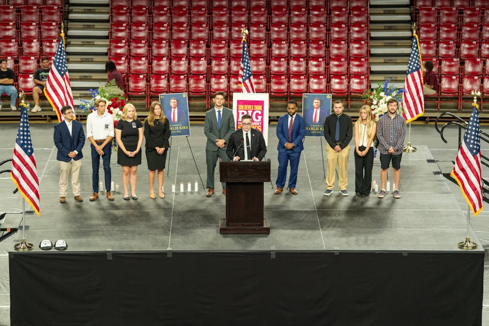 Speakers and organizers stand on stage during a vigil honoring Charlie Kirk at Desert Financial Arena on Monday, Sept. 15, 2025, in Tempe.