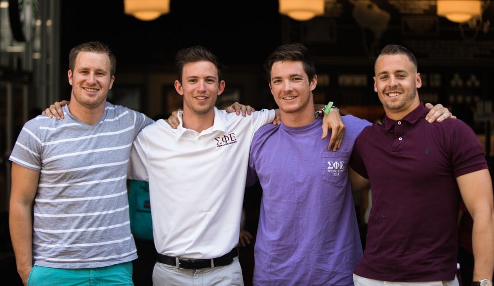 (L-R) Man Up ASU president Sam Richardson, Sigma Phi Epsilon president Jack Stevens, Sigma Phi Epsilon vice president Rick DeCarli, and Man Up ASU officer Nick Parkos at the Memorial Union on April 21, 2015. Sigma Phi Epsilon recently joined the Man Up ASU organization to make a stand against sexual violence. (Daniel Kwon | The State Press)