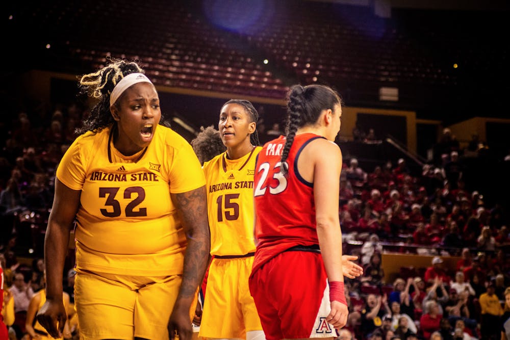 Graduate student center Nevaeh Parkinson (32) celebrates after scoring at Desert Financial Arena on Saturday, March 1, 2025, in Tempe. ASU lost 71-59.