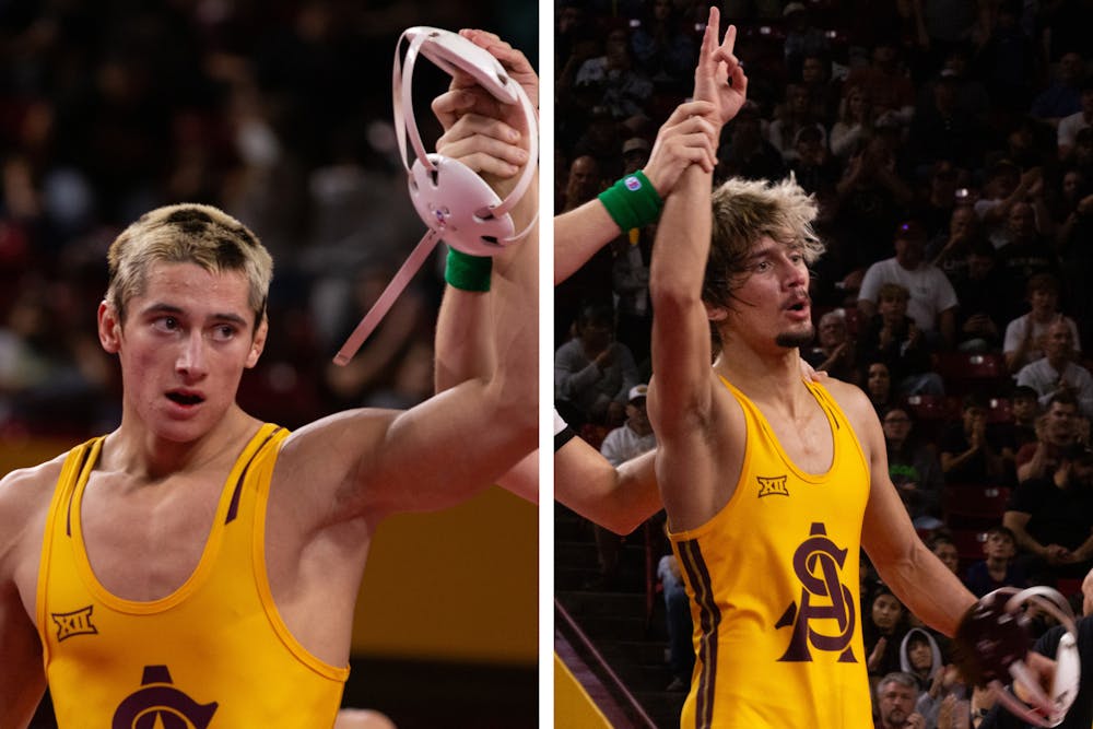 ASU redshirt sophomore wrestler Kaleb Larkin (left) and ASU freshman wrestler Kyler Larkin during a match against OSU on Sunday, Nov. 23, 2025, in Tempe. ASU lost 11-25.