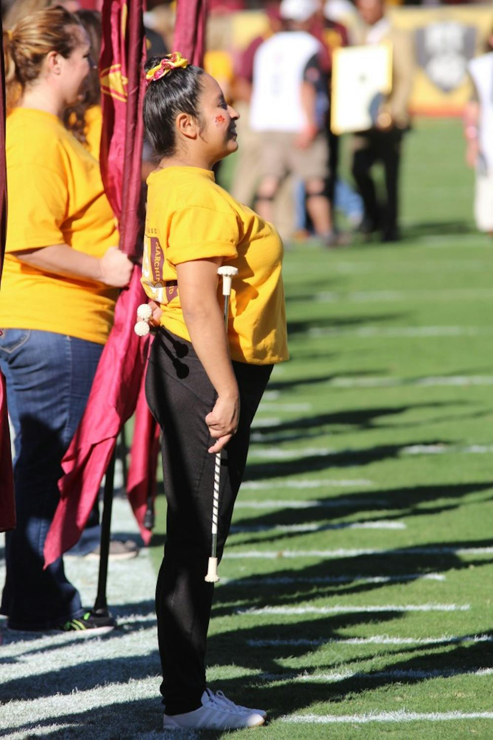 The Arizona State Marching Band celebrates it's 100-year history by having alumni join in the performance of the halftime show at the homecoming game against Washington on Saturday, Nov. 15, 2015, at the Sun Devil Stadium.