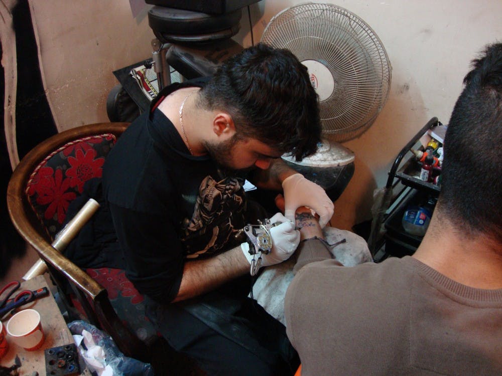 Mohammed Akram Taher, 25, a former U.S. Army translator nicknamed "Dante," runs a Baghdad tattoo parlor. Here, he works on a client. (Molly Hennessy-Fiske/Los Angeles Times)