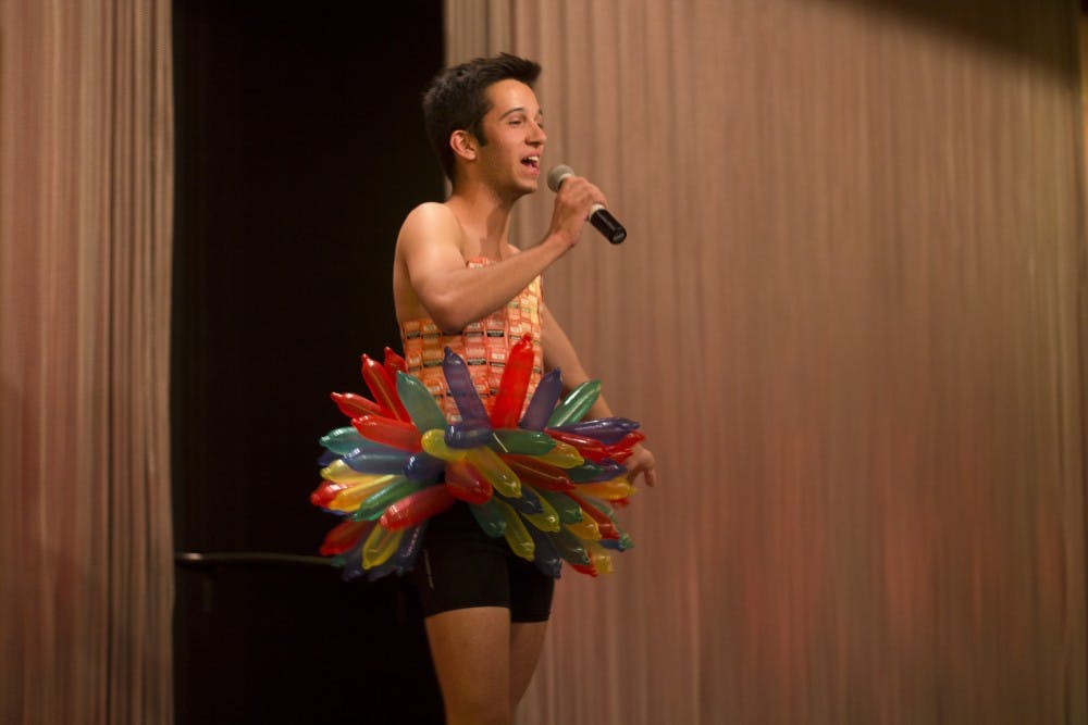 ASU’s Graphic Information Technology freshman Zach Bramwell speaks The Climax, a Drag and Condom Fashion Show organized by Devils in the Bedroom. The show featured outfits made of expired condoms in an attempt to spread awareness as a part of the Sexual Wellness Week at ASU.