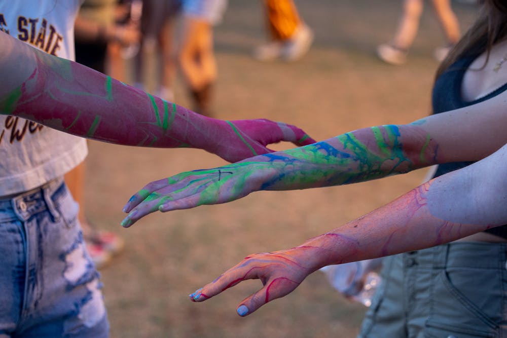 Devilpalooza attendees fan dry their arms after getting them dyed on the SDFC fields on Saturday, March 28, 2026, in Tempe.