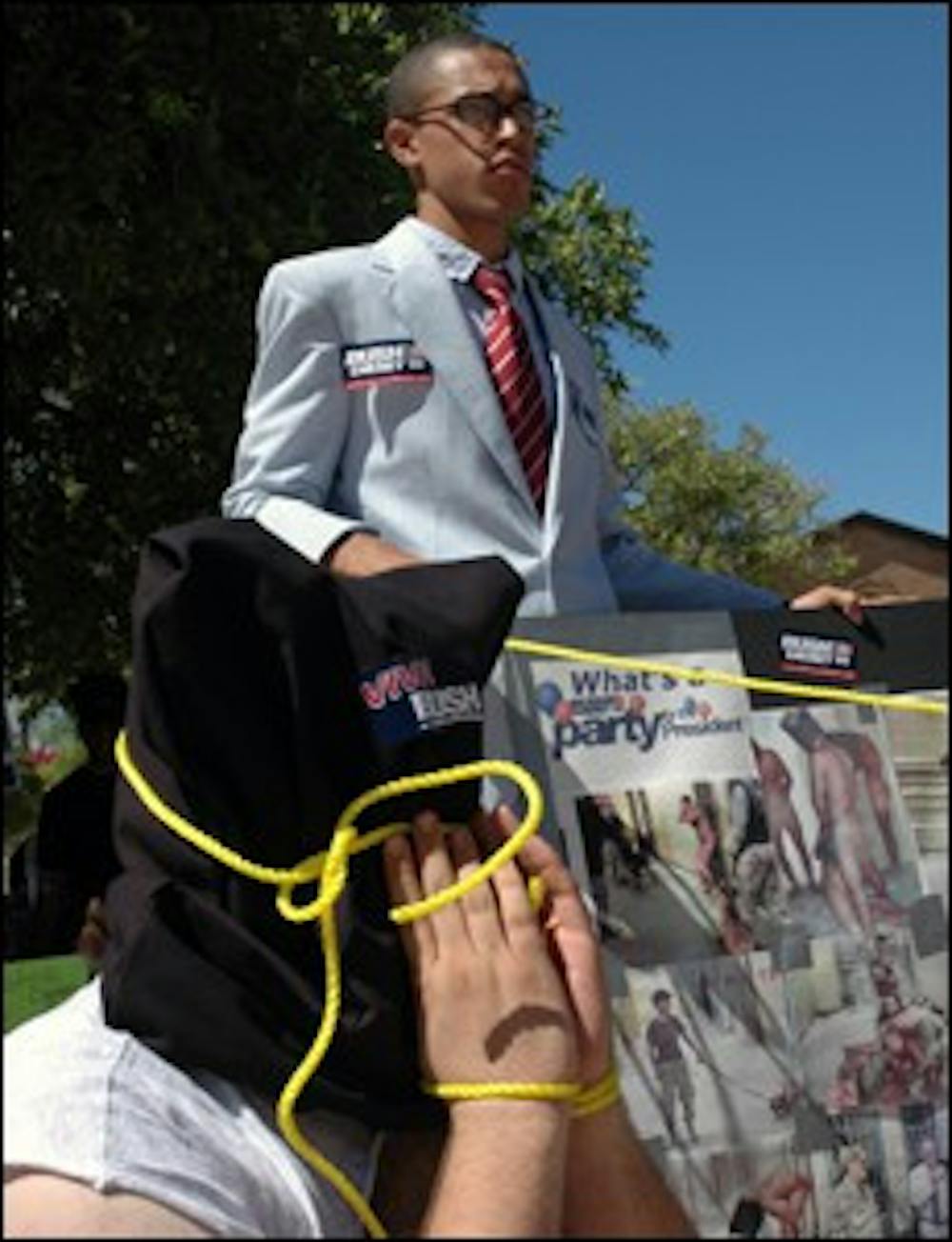 ASU alumnus Matt Garcia (with hood) and senior photography student Nathaniel Mata protest against the Abu Ghraib prison scandal in front of the Memorial Union Wednesday.