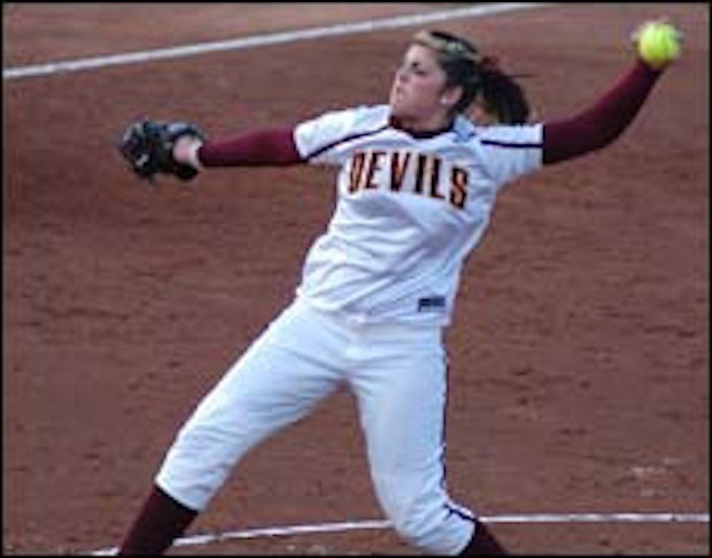 Aldei Gregoire / THE STATE PRESS ASU freshman left-hander Katie Burkhart narrowly missed pitching a no-hitter Wednesday in the first game of a doubleheader against Eastern Michigan at Farrington Stadium. She gave up one run on one hit to earn her fourth win of the season.