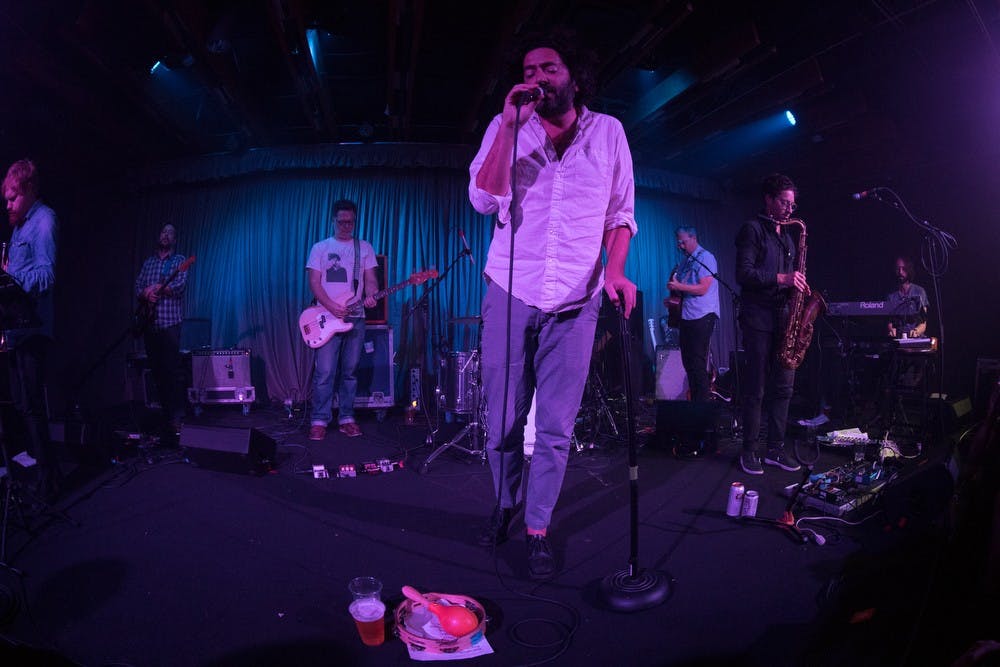 In this photo taken with a fisheye lens, Destroyer lead singer Dan Bejar performs songs from the band's newest album 'Poison Season' on Monday, Sept. 21, 2015, at Crescent Ballroom in Phoenix.