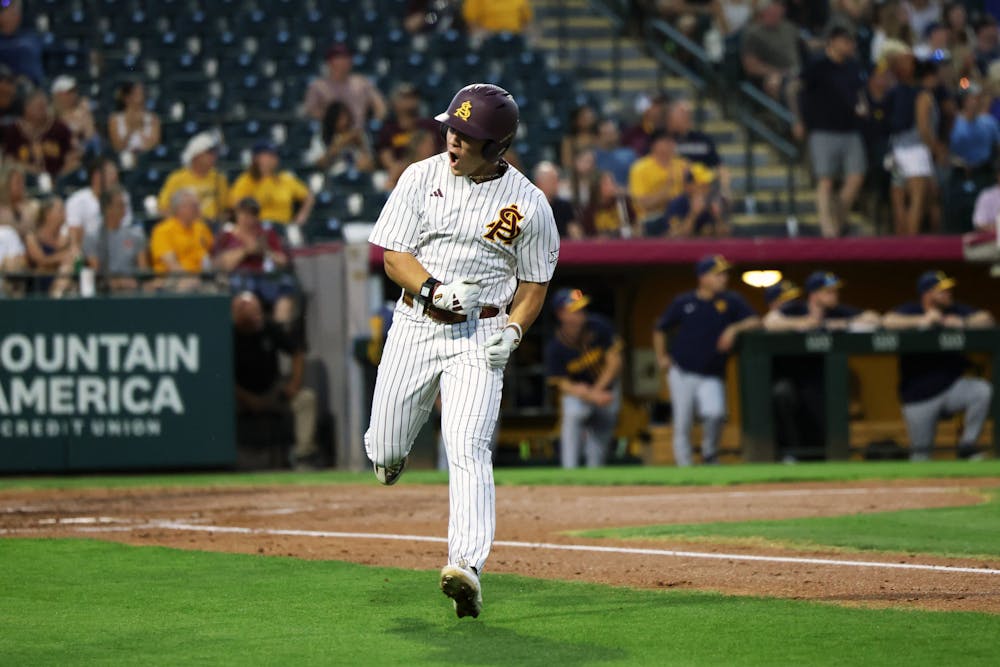 ASU sophomore infielder Landon Hairston (3) celebrating a home run on Friday, March 27, 2026, at Phoenix Municipal Stadium in Phoenix. ASU won 14-4.
