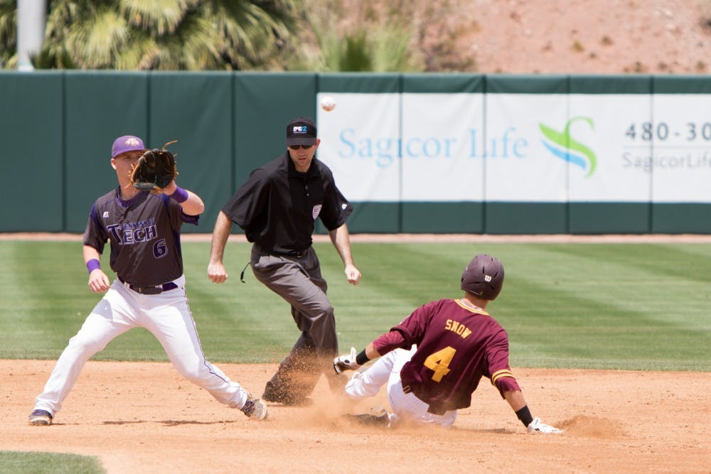 Freshman Andrew Snow reaches second base on an error in the bottom of the second inning against Tennessee Tech at Phoenix Municipal Stadium Sunday April 26, 2015. The Sun Devils defeated the Golden Eagles 16-4.