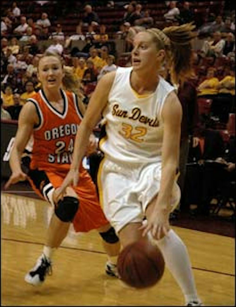 ASU junior forward Kristen Kovesdy, right, shoots over Oregon State freshman forward Tiffany Ducker at Wells Fargo Arena on Thursday night. See story, page 11.