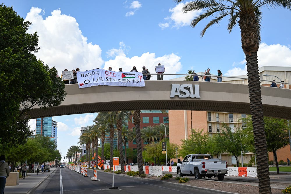 Organizers with Students for Justice in Palestine at ASU protesting through campus on April 3, 2025 in Tempe.