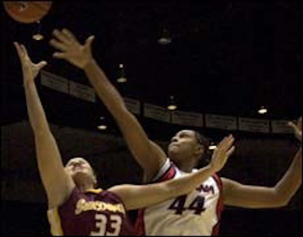 Junior forward Amy Denson, left, fights for a rebound with senior center Danielle Adefeso in a