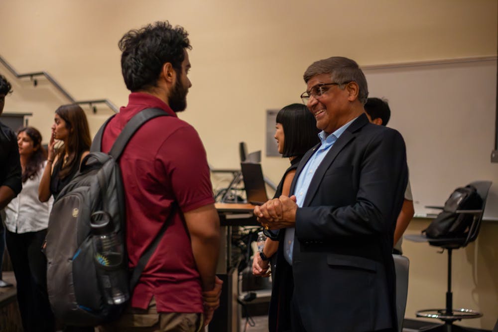 Sethuraman Panchanathan, 15th Director of the National Science Foundation, talks with students after his GlobeTalk presentation on Friday, Sept. 5, 2025 in Tempe.