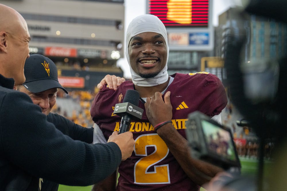 ASU redshirt senior quarterback Jeff Sims (2) speaks during a postgame interview after a game against West Virginia on Nov. 15, 2025, at Mountain America Stadium in Tempe. ASU won 25–23.