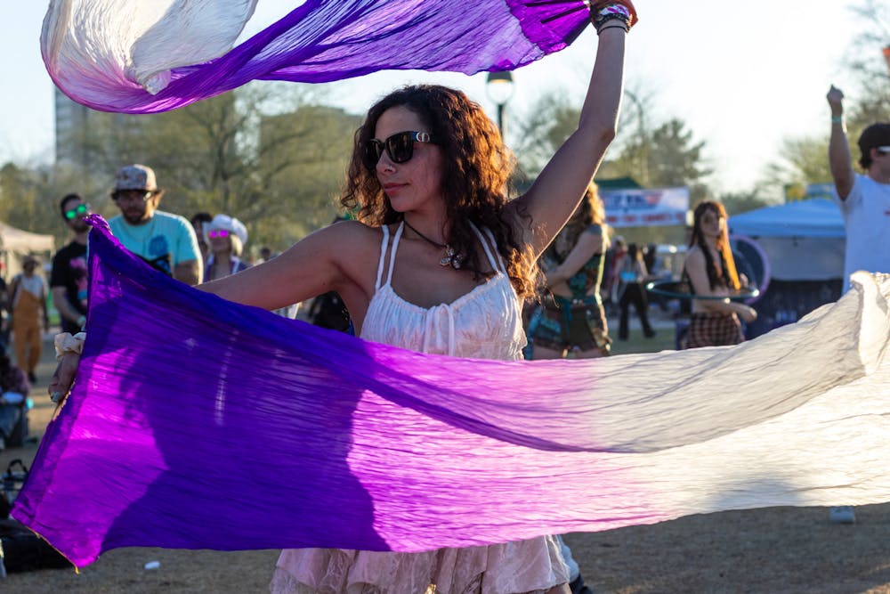 M3F attendee Ryley Gonzalez dances with flow fans in the crowd on Saturday, March 7, 2026, at Steele Indian School Park in Phoenix.