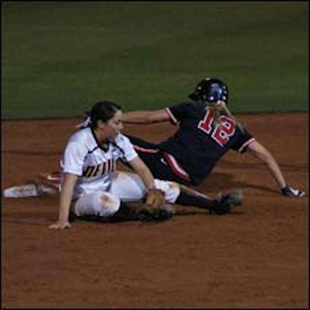 Freshman shortstop Rhiannon Baca, left, cuts off a throw Wednesday night as senior right fielder Allyson Von Liechtenstein slides into second base. UA topped ASU 1-0 for its 10th consecutive win in the rivalry.