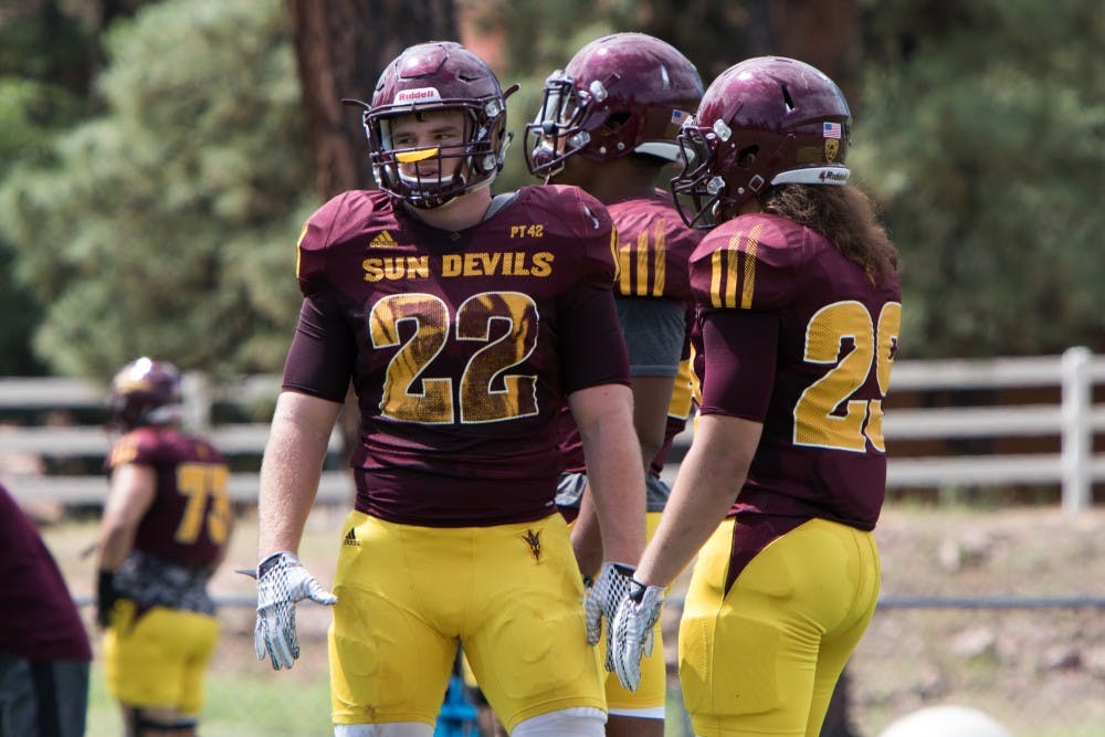 Freshman Linebacker Nick Ralston (22) waits for instruction during Camp Tontozona practice Wednesday August 12, 2015 at Rumsey Park in Payson, Arizona. (Jacob Stanek/The State Press)