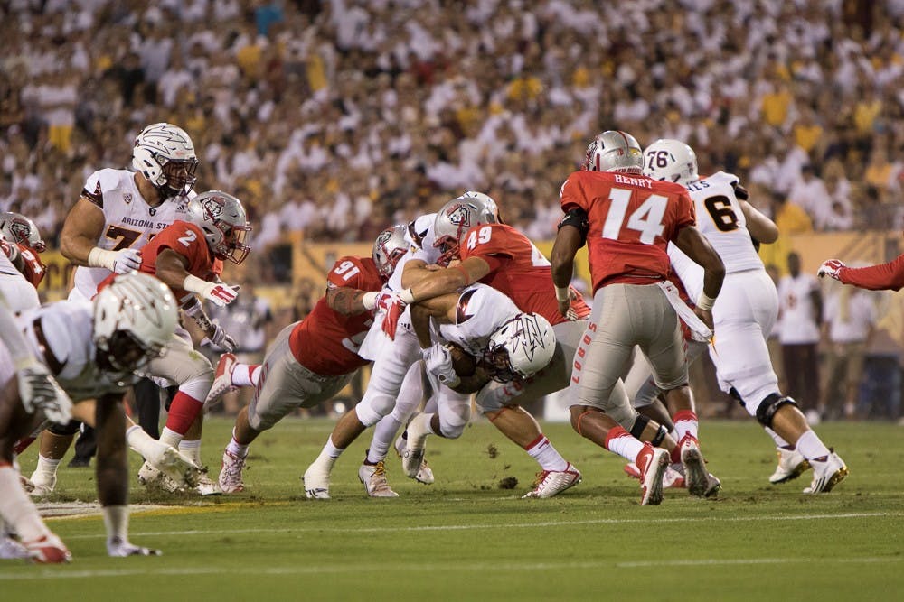 Senior wide receiver D.J. Foster is tackled by the New Mexico defense on Friday, Sept. 18, 2015, at Sun Devil Stadium in Tempe.