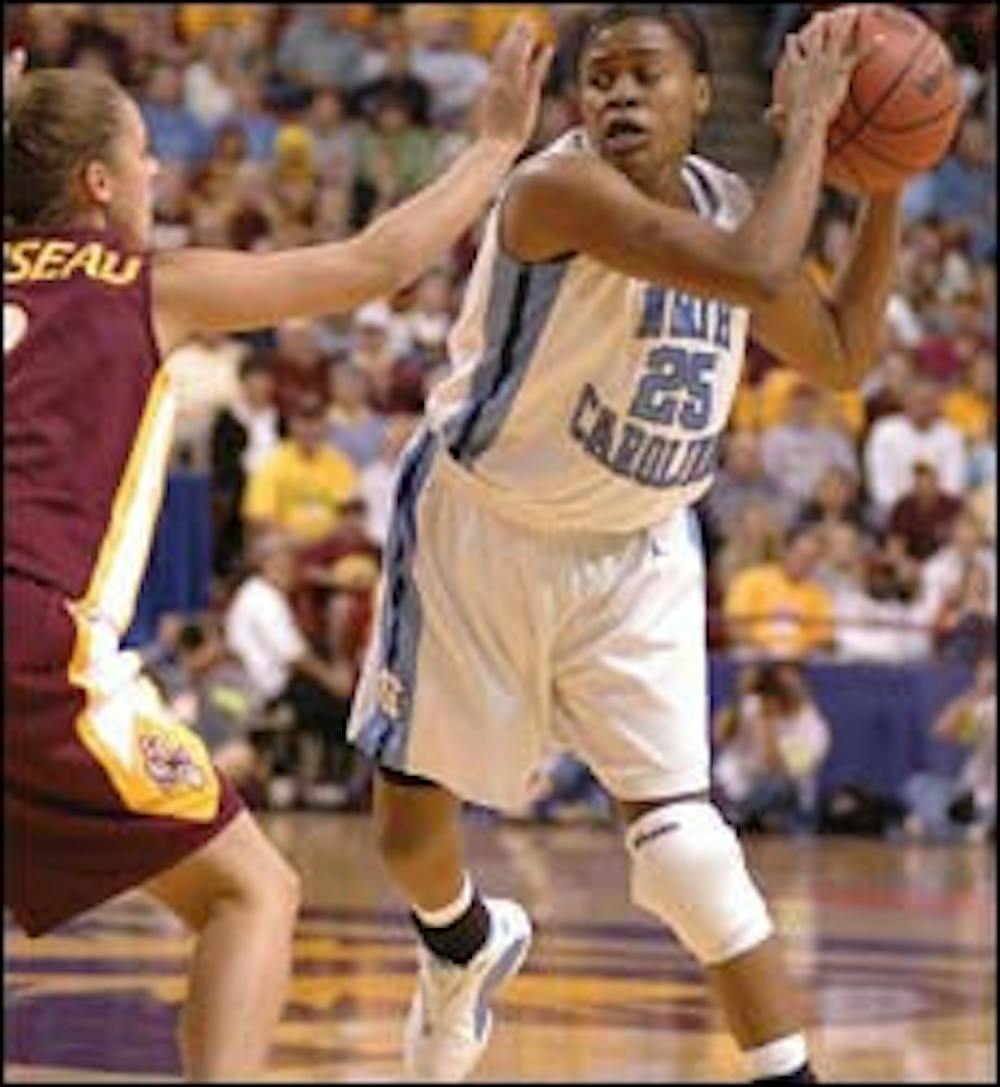 North Carolina senior guard Leah Metcalf (25) shields the ball from ASU freshman guard Reagan Pariseau in North Carolina's 79-72 win in the Tempe Regional semifinal at Wells Fargo Arena.