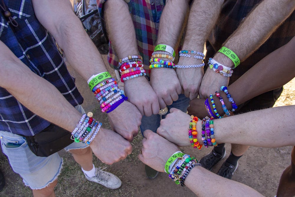 M3F attendees stand in a circle to show their kandi at Steele Indian School Park on March 6, 2026 in Phoenix.