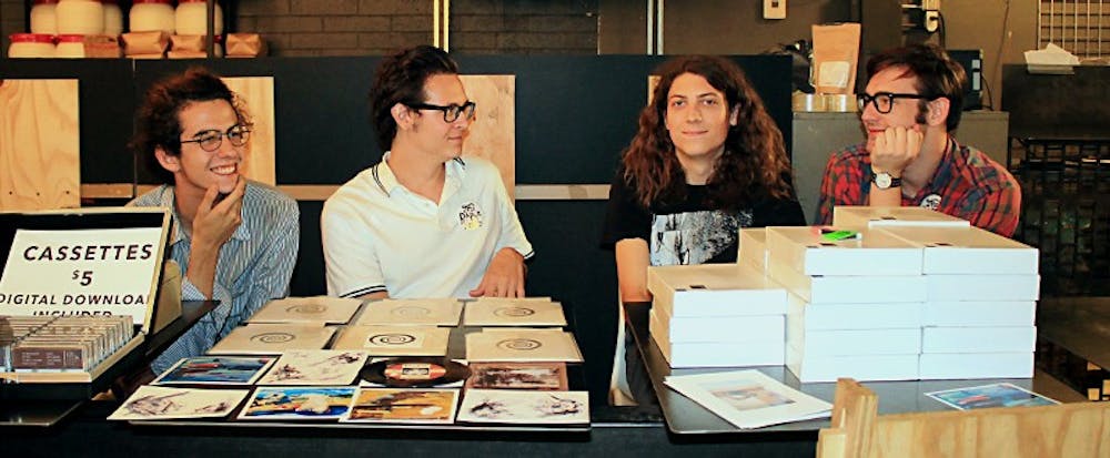 The Paper Knife team comprising of (left) English literature senior Robbie Boccelli, art senior and art curator Chris Czaja, alumni Evan Bisbee and political science and philosophy junior Cody Inglias supervise during the release of the second volume of their print publication at Cartel Coffee Lab in Tempe.(Photo by Shiva Balasubramanian)