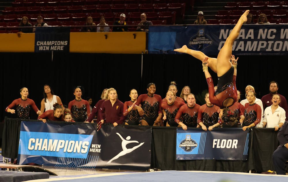 ASU gymnastic team cheers for all around junior Halle Gregoire on floor at the NCAA Regional first round against University of Arizona on at Desert Financial Arena on Wednesday, April 1, 2026, in Tempe. ASU won 195.425-194.900.