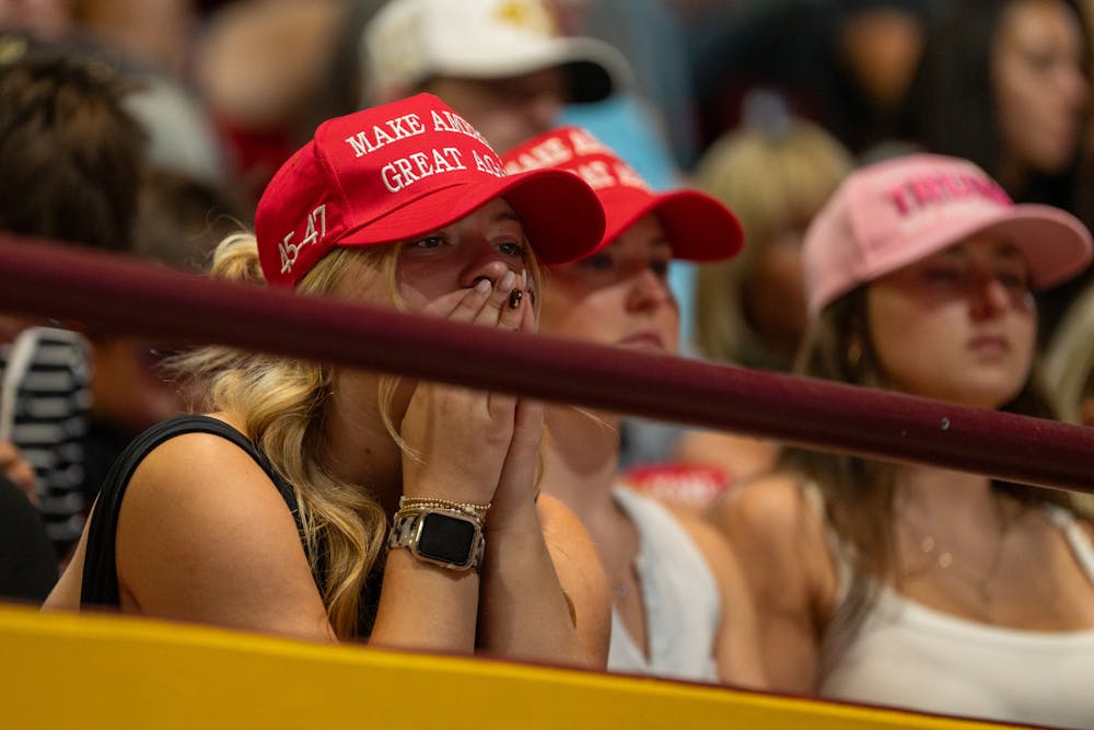 An attendee reacts emotionally during a vigil honoring Charlie Kirk at Desert Financial Arena on Monday, Sept. 15, 2025, in Tempe.