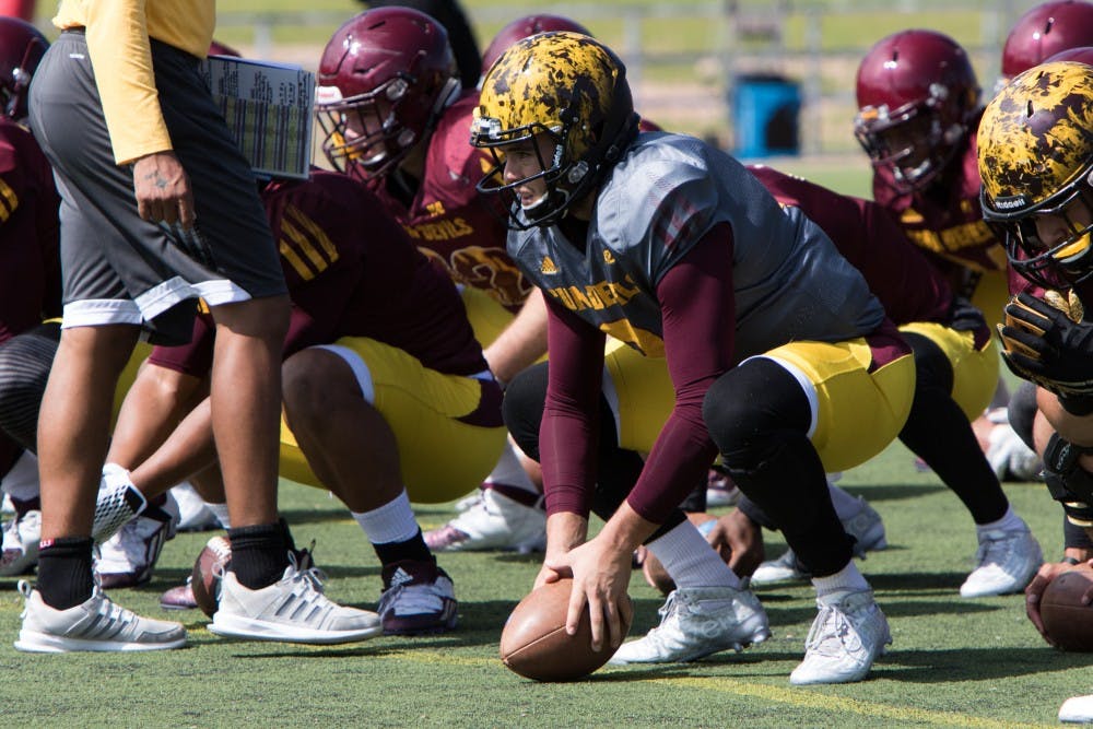 Redshirt senior Quarterback Mike Bercovici stretches during Camp Tontozona practice Wednesday August 12, 2015 at Rumsey Park in Payson, Arizona. (Jacob Stanek/The State Press)
