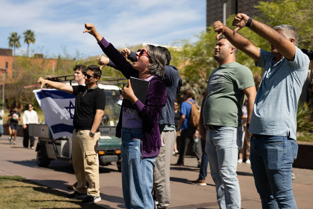 Counter-protesters at a demonstration from the Party of Socialism and Liberation at Hayden Lawn at ASU on Monday, March 2, 2026, in Tempe.