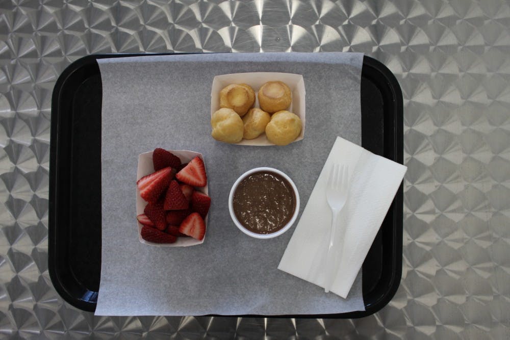Everybody Loves Fondue's popular milk chocolate fondue pairs well dipped with fresh strawberries and creme puffs in Gilbert, Arizona on Tuesday, April 19, 2016.