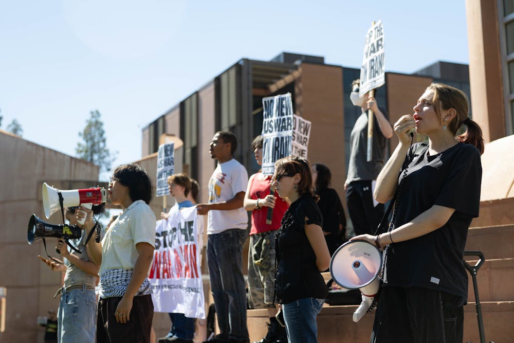 Anti-war protesters from the Party of Socialism and Liberation demonstrate at Hayden Lawn at ASU on Monday, March 2, 2026, in Tempe.